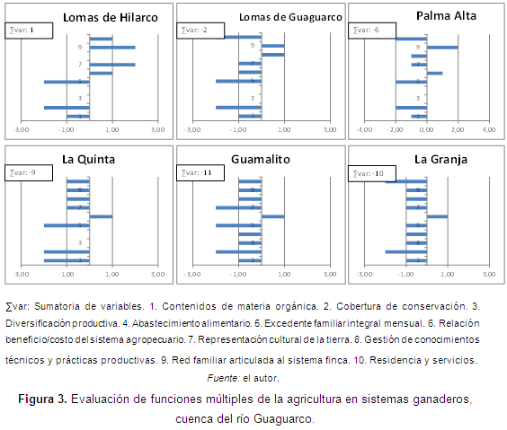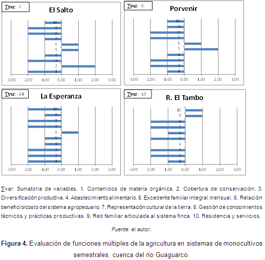 La evaluación de multifuncionalidad de estas formas de agricultura demuestra que existen diversos grados de funcionalidad para cada una; mientras que los sistemas de agricultura tradicional se muestran multifuncionales (promedio de variables de 8,63), los sistemas ganaderos (promedio de variables de -6,0) y de monocultivos semestrales (promedio de variables de -11,0) se muestran poco funcionales generando externalidades negativas que comprometen su estabilidad en el tiempo.