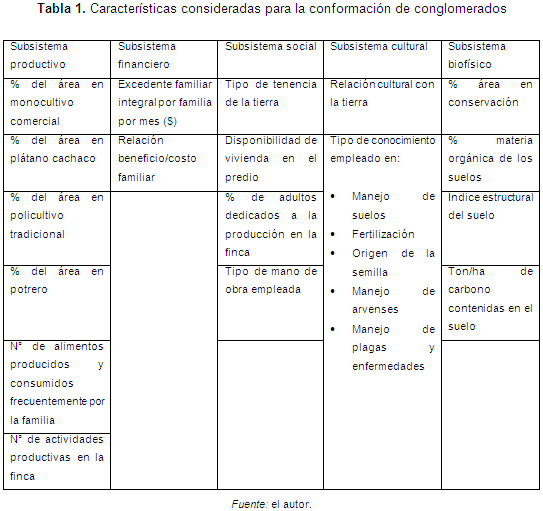 El análisis de conglomerados conformó tres grupos de sistemas de finca, diferenciados por un total de 19 de las 22 características que resultaron determinantes para la agrupación. Siete características tienen una alta significancia en la conformación de los grupos; entre estas se cuentan 5 del subsistema productivo (número de alimentos para autoconsumo, % del área en potreros, % del área en policultivos tradicionales, % del área en monocultivo comercial y número de actividades productivas) y 2 características del subsistema cultural (tipo de conocimiento en el manejo de suelos y tipo de conocimientos en la fertilización). Esto muestra que las características que marcan las mayores diferencias entre los conglomerados están relacionadas principalmente a la configuración de la producción y el tipo de conocimientos empleados en la gestión de la producción.
