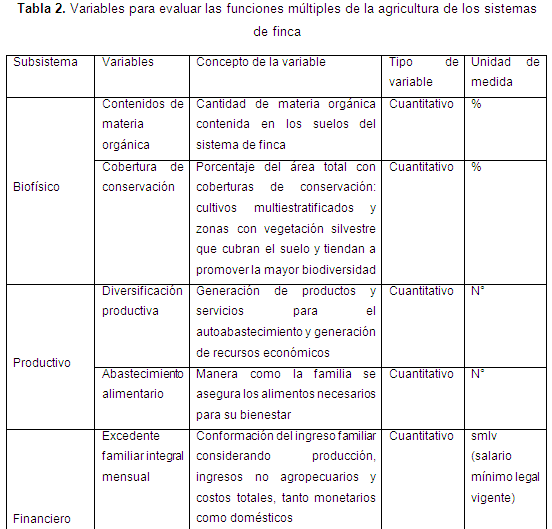 La investigación se desarrolló en dos fases: 1) caracterización de los sistemas de finca y 2) evaluación de la multifuncionalidad de la agricultura. Para la primera fase se tomaron 22 características representativas de los cinco subsistemas sugeridos por Fleskens, Duarte & Eicher (2009) y Gómez-Sal & González (2007): biofísico, productivo, financiero, social y cultural (tabla 1).