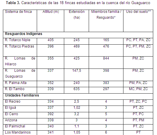 En cuanto al uso del suelo se destaca que las áreas de conservación natural incluyen bosques primarios y secundarios y se ubican principalmente en la parte alta de la cuenca. Entre las 18 fincas incluidas en el estudio se presentan diversos arreglos de cultivos generalmente combinados en cada finca. En 14 de ellas existen zonas dedicadas a la conservación natural (ZC), quedan excluidas 3 unidades familiares de áreas relativamente pequeñas y una unidad empresarial cuyo encargado paga alquiler por el terreno donde produce. Tres de las 18 fincas se dedican al Monocultivo Comercial (MC), solo una (La Esperanza) tiene dedicación exclusiva al MC. Estos arreglos se presentan exclusivamente en las unidades empresariales seleccionadas. La ganadería está presente en 11 fincas, especialmente en resguardos indígenas y unidades empresariales, bien en forma de Monocultivos de Pastos (MP) o Potreros Arborizados (PA). El Policultivo Tradicional (PT) se presenta en 12 fincas incluidas todas las unidades familiares, 2 lotes comunitarios de los 6 resguardos indígenas y solo una unidad empresarial. Finalmente, las fincas productoras de plátano cachaco son 5; 2 de ellas corresponden a unidades familiares y 2 a resguardos indígenas de la parte alta de la cuenca.