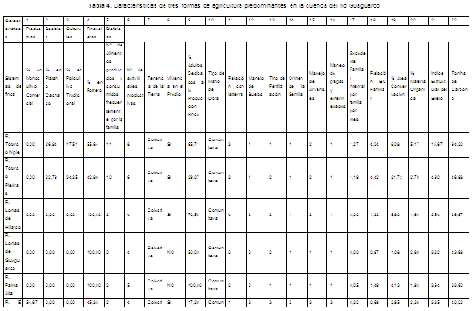 La caracterización multifuncional de la estructura y funcionamiento de los sistemas de finca permitió identificar las formas de agricultura que prevalecen en la cuenca del río Guaguarco, sus características, mezclas, adaptaciones e innovaciones generadas por los propios agricultores; pudiéndose establecer que no existe una masa homogénea de sistemas sino un mosaico de formas productivas híbridas a lo largo de toda la cuenca, en las que cada familia agricultora aplica estrategias productivas de acuerdo a su cultura y sus necesidades particulares, tamaño del predio, racionalidad ecológica, económica y productiva, que fueron agrupadas como sistemas de agricultura tradicional, sistemas de producción ganadera y sistemas de monocultivos semestrales.