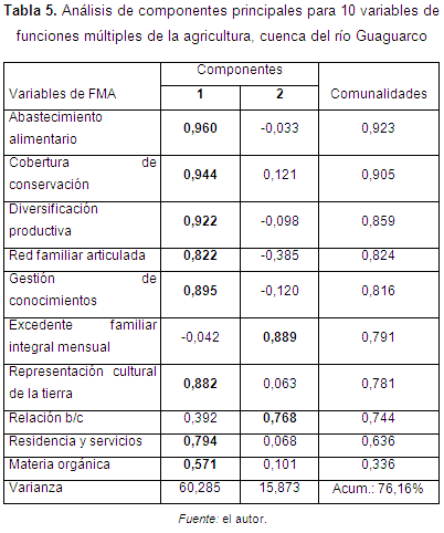 En el análisis estadístico multivariado por componentes principales, por su parte, las 10 variables de multifuncionalidad que integran el estudio son resumidas en dos componentes o nuevas variables que explican el 76,16% de la varianza total explicada por el comportamiento de los datos (tabla 5), es decir que estos dos componentes describen suficientemente el conjunto de las 10 variables sin perder información importante. Las cargas factoriales más significativas de la matriz muestran dos componentes, el primero de los cuales explica fuertemente la variabilidad de las variables de los subsistemas biofísico, productivo, social y cultural; mientras que el segundo componente explica la variabilidad de las variables del subsistema financiero.
