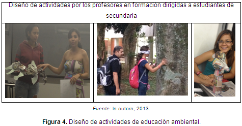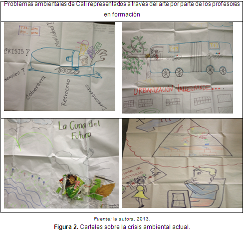Y finalmente, ellos debían representar una problemática ambiental que ellos han vivido en la ciudad de Cali. En esta actividad, los profesores en formación debían explicar oralmente las razones y el significado de su representación gráfica, permitiendo reconocer cómo los problemas socioambientales son producidos por el mismo ser humano y cómo sus efectos son a nivel sistemático, es decir, se afecta tanto la flora, la fauna como los actores sociales del contexto.