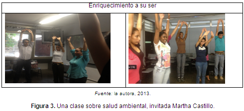 En una de las sesiones se planteó el escenario de intercambio, y el principio Reconocimiento del yo, otro y oikos, desde una ética ambiental y un sistema de valores ambientales, a través del uso de la poética y estética, y del Potenciamiento de diferentes tipos de conocimientos desde el conocimiento cultural; para ello, se plantean dinámicas que permitirán el reconocimiento del ser como individuo y ser social como el reconocimiento de diferentes formas de producción del conocimiento. Para ello, se les planteó a los estudiantes tres momentos en la clase: en el primero de ellos se realizó un debate a nivel conceptual sobre los planteamientos de Ángel Maya, posteriormente se les presentó una obra de arte con el propósito de realizar una traducción simbólica de la imagen como un acto de comunicación intercultural y de reconocimiento de las diferentes formas de producción de conocimiento, como medio de expresión de la relación hombre--naturaleza.