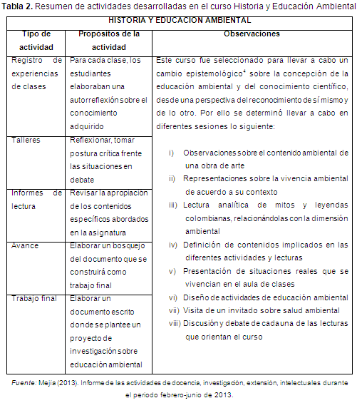 Posteriormente, se aplicó la propuesta para un curso dentro de un programa de formación docente, denominado Historia y Educación Ambiental, dirigido a estudiantes de 5º semestre con el propósito de generar un pensamiento ambiental y una concepción del conocimiento científico desde una perspectiva cultural.