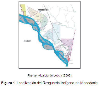 El asentamiento Tikuna de Macedonia se encuentra ubicado en el Trapecio Amazónico a 50 km de Leticia (figura 1), capital del departamento del Amazonas (Tobón y Ochoa, 2010). El Resguardo se localiza en la zona de amortiguación del Parque Nacional Natural Amacayacu y limita al norte con la comunidad de Mocagua, la quebrada Mata-matá y la finca El Zapote; al sur con la comunidad del Vergel; al oriente con los baldíos nacionales y al occidente con el río Amazonas (Parques Nacionales Naturales, 2005).