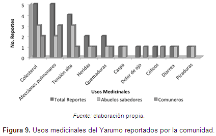 Sumado a lo anterior, en el Resguardo se reportó el uso popular del Yarumo para la diabetes, el SIDA y como relajante (Quintana, 2009). En la figura 9 se observa que las principales enfermedades que los indígenas de esta comunidad pueden tratar con esta planta son el colesterol, las afecciones pulmonares y la tensión alta.