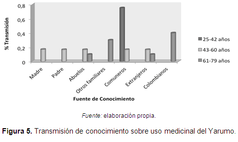 Todos los jóvenes entrevistados aprendieron usos medicinales del Yarumo de personas residentes de la comunidad, especialmente de los abuelos sabedores (figura 5). Asimismo, los ancianos mayores adquirieron su conocimiento de colombianos externos a la comunidad y de otros familiares. La transmisión del uso medicinal en las personas entre 43-60 años fue proporcional (17%), la cual se dio por el padre, abuelos, comuneros y extranjeros.