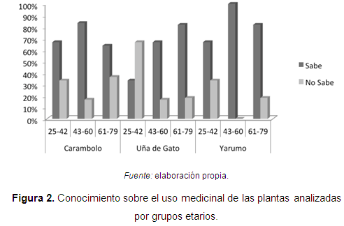 Se encontró en el grupo de las personas con mayor edad un predominio del conocimiento del uso de las plantas medicinales, especialmente sobre la Uña de Gato y el Yarumo (82% para ambas plantas). Contrario a esto, en el grupo de personas jóvenes se evidenció que la mayoría no sabía los posibles usos medicinales de la Uña de Gato (67%). En el grupo etario de 43-60 años todos los individuos tenían conocimientos sobre algún uso medicinal del Yarumo (figura 2).
