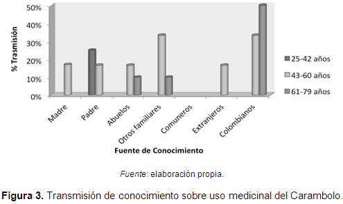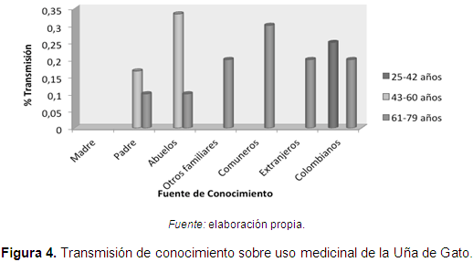 Al indagar sobre las fuentes de conocimiento para cada una de las plantas, se encontró que la familia, especialmente los abuelos, sigue teniendo un rol significante en la transmisión del saber a través de la tradición oral y las actividades cotidianas (López, 2010). No obstante, la incidencia de la madre fue baja tanto en el Carambolo como en el Yarumo, y nula en la Uña de Gato. Es probable que el difícil acceso a esta última en el Resguardo, por escasez y las grandes distancias que hay que recorrer para obtenerla, ha hecho que se privilegie el uso otras plantas medicinales de fácil acceso (Kvist et al., 2001). Por consiguiente, el conocimiento sobre el uso de la Uña de Gato se ha restringido más hacia los abuelos sabedores, quienes han tenido contacto con personas externas a la comunidad y de las cuales han adquirido parte de su saber. Este tipo se conoce como "conocimiento distribuido" porque no es compartido por toda la comunidad, pero sí se sabe quién la posee y se recurre a él (Zerda, 2003).