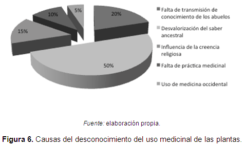 La disminución del modo tradicional de vida indígena en Macedonia y de su lengua, han sido punto de partida para la pérdida del conocimiento tradicional, en el que se encuentra el saber medicinal (Vengoechea, 2012). Como se observa en la figura 6, se presentaron varias causas para el desconocimiento del uso medicinal del Carambolo, Yarumo y Uña de Gato en el Resguardo, y se destacaron la desvalorización del saber ancestral y la falta de transmisión de conocimientos por parte de los abuelos.