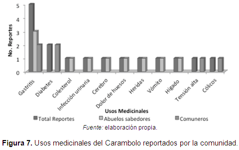 La comunidad reportó cuatro usos medicinales para el Carambolo: apendicitis, artritis, diarrea y vómito, siendo este último el punto de coincidencia entre los dos estudios (figura 7). En la literatura también se han presentado otros usos medicinales de esta planta. Por ejemplo, Pérez y Vázquez (2004) encontraron que en la India esta planta se usa para tratar las hemorragias, las hemorroides, la fiebre y las infecciones en los ojos; mientras que en Brasil se emplea para el vómito y como diurético.