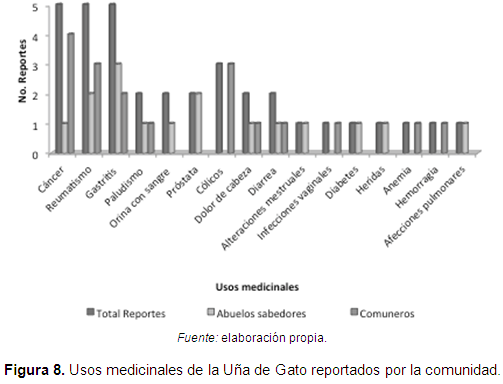 El cáncer, el reumatismo y la gastritis fueron las enfermedades que más se reportaron como tratables con la Uña de Gato en la comunidad (figura 8). Esto coincide con los usos medicinales de esta planta encontrados en Macedonia, tales como la artritis, los cólicos, el cáncer y la inflamación (Quintana, 2009).