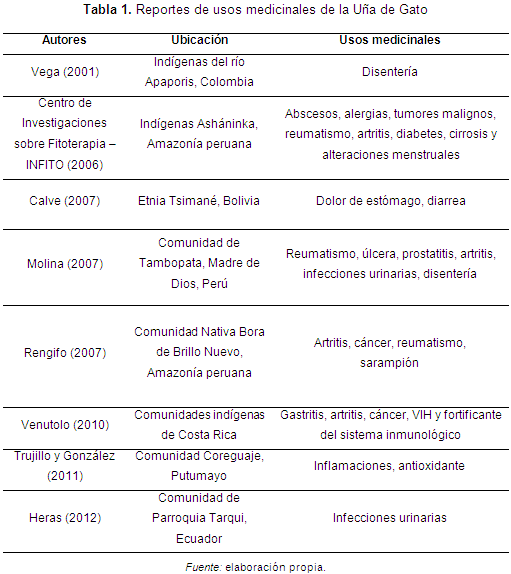 Otros reportes de usos medicinales en comunidades indígenas se han hecho en países como Colombia, Ecuador, Costa Rica, Bolivia, y principalmente Perú (tabla 1). Estudios clínicos (Gonçalves, Dinis y Batista, 2005; Chin-Wong et al., 2008; Domingues et al., 2011; Bors et al., 2012;Santos et al., 2012, Dreifuss et al., 2013) corroboran sus efectos antiinflamatorios, inmunoestimulatorios, anticancerígenos, antioxidantes, antitumorales y antimutagénicos. De igual forma, sirve para contrarrestar enfermedades como la diabetes, la gastritis, la artritis y algunas enfermedades epidémicas como el dengue (Riva et al., 2001;Reis et al., 2008).