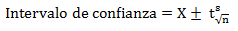 siendo: X = media muestral. t = valor de t que corresponde al intervalo de confianza. S = desviación estándar de la muestra. n = tamaño de la muestra.