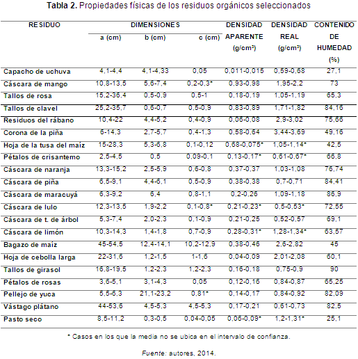 Los residuos recolectados y seleccionados fueron: capacho de uchuva (Physalis peruviana), tallos de rosa, tallos de clavel, residuos del rábano (Raphanus sativus L.), corona de la piña (Ananas comosus L. Merr.), hoja de la tusa del maíz (Zea mays), pétalos de crisantemo (Chrysanthemum L.), cáscara de naranja (Citrus sinensis), de piña (Ananas comosus L. Merr.), de maracuyá (Passiflora edulis), de lulo (Solanum quitoense), de mango (Mangifera indica), de tomate de árbol (Cyphomandra betacea), de limón (Citrus limon L.), bagazo de maíz (Zea mays), hoja de cebolla larga (Allium fistulosum), tallos de girasol (Helianthus annuus), pétalos de rosas, pellejo de yuca (Manihot esculenta), bagazo de plátano (Musa paradisiaca L.), tallos de clavel (Dianthus caryophyllus), pasto seco (Pennisetum clandestinum). Estos se recolectaron en las plazas de mercado, fruterías y en cultivos aledaños a la ciudad de Bogotá D.C. A cada uno de los residuos se le realizó un análisis físico con 6 repeticiones para caracterizar su estado físico. En la Tabla 2 se muestran los resultados obtenidos.