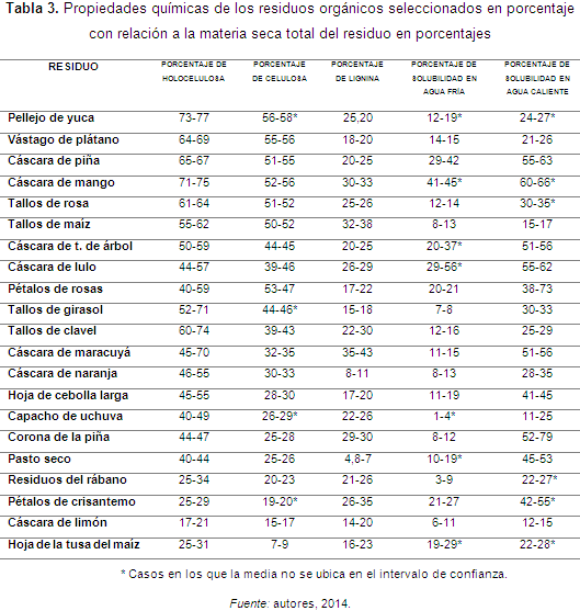 Aunque el contenido de celulosa es un factor determinante para el uso de los residuos orgánicos en la producción de papel, no es la única propiedad que se debe considerar. El proceso productivo depende de otras propiedades como la solubilidad en agua, los contenidos de lignina, la consistencia de los residuos que podrían generar la necesidad de más procesos mecánicos o químicos. Lo importante es desarrollar procesos limpios, al alcance de todas las comunidades, y según las propiedades físicas obtenidas es posible desarrollar estos procesos porque hay residuos que no tienen tan altos contenidos de lignina, como los tallos, cáscaras de frutas, corona de la piña, y para los cuales no es difícil la extracción de la celulosa.