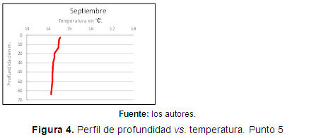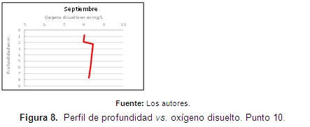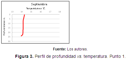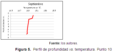 Sintetizando, en todos los puntos para la temperatura superficial los valores más bajos se presentaron julio y septiembre y los valores más altos en el mes de mayo. A la máxima profundidad la temperatura más baja se registró en el punto 10 en el muestreo realizado en julio con un valor de 13,26 OC. y la temperatura más alta se registró en el punto 7 durante enero con 17,32 OC. y en mayo con 17,1 OC.