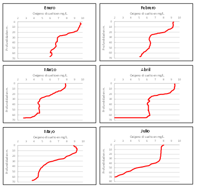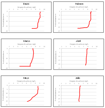 Los valores más bajos de oxígeno disuelto en superficie se encontraron en julio y septiembre, pero a su vez, en estos mismos meses se encontraron los valores más altos en el fondo. Las mayores variaciones en todos los puntos se registran en el punto 10, punto cercano a la llegada del afluente río Encano