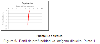 PERFILES DE PROFUNDIDAD VS. OXÍGENO DISUELTO. A continuación se presentan los perfiles de profundidad vs. temperatura para el punto 1 (figura 6), punto 5 (figura 7) y punto 10 (figura 8), los cuales son representativos de cada uno de los grupos que se pudieron diferenciar en los sitios de muestreo.