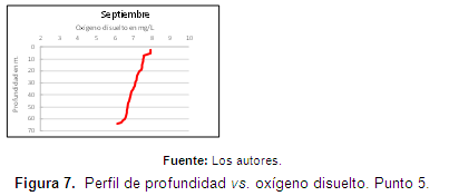 En los puntos más profundos, puntos 4, 5 y 7, se evidencia el descenso casi constante de la concentración de oxígeno después de los 30 metros, en los otros puntos que son menos profundos, no se llega a evidenciar el descenso casi constante en algunos meses, pero para todos es claro que la concentración de O.D disminuye al bajar la temperatura.