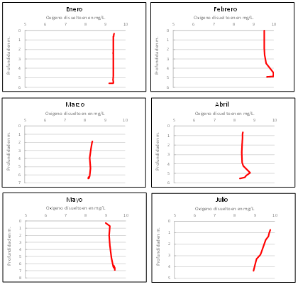 Finalmente, se puede afirmar que LLC tiene buena calidad de agua dado que las gráficas ortógradas se pueden construir únicamente a partir de los datos que se encuentran en lagos que presentan una oligotrofia moderada y durante los meses en los que los reportes generan gráficas clinógradas, no se llega a las condiciones de anoxia, pero sí se encuentran concentraciones de oxígeno disuelto, totalmente compatibles con formas de vida acuática. La mezcla completa de la columna de agua permite la entrada de oxígeno a las capas inferiores y un reemplazo constante, aun en el fondo.