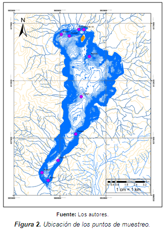 Las mediciones de profundidad, temperatura y oxígeno disuelto, parámetros con los cuales se determinó la estructura térmica, se realizaron en varios puntos representativos de LG seleccionados, según la metodología propuesta por Bonilla y Guillot (2003). Se hizo un recorrido en zigzag de sur a norte, con una longitud aproximada de 20 km, iniciando en la vereda Santa Lucía y terminando en la entrada nueva del río Encano. Las mediciones se realizaron en diez puntos (ver Figura 2), con el fin de obtener la mayor cobertura espacial de LG. Las mediciones mensuales se hicieron el mismo día en todos los puntos, iniciando en el punto 1 a las 8 de la mañana y terminando en el punto 10 a las 4 de la tarde.
