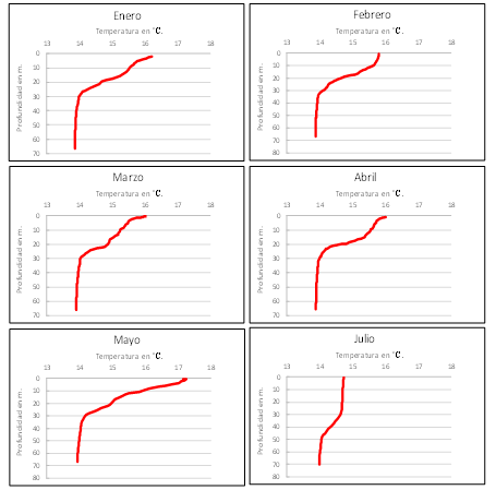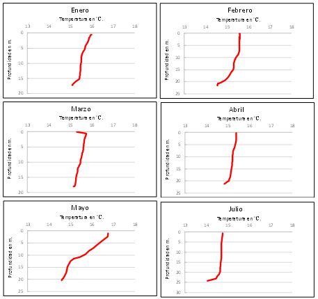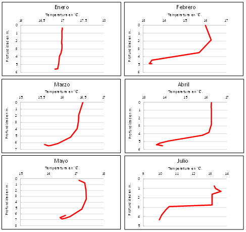 Durante los meses en lo que se adelantó esta investigación, mayo es el único que presenta una termoclina claramente diferenciada; julio y septiembre presentan condiciones de isotermia, es decir, presentan una mezcla completa en la columna de agua; enero, febrero, marzo y abril tienen condiciones de mezcla completa en algunos puntos y en otros una termoclina débil, la cual se presenta principalmente en los puntos donde la profundidad supera los 50 metros.