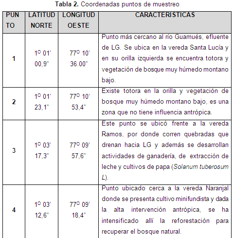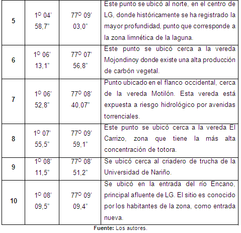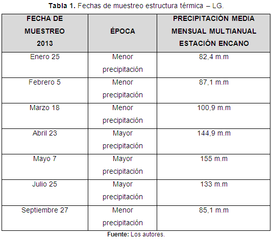 UBICACIÓN DE LOS PUNTOS DE MUESTREO. Para evidenciar la variación temporal de la estructura térmica de LG, se hicieron mediciones mensuales desde enero hasta septiembre de 2013 (véase tabla 1). Los meses de muestreo abarcaron las épocas de mayor y menor precipitación. Los registros de la precipitación media anual en la estación climatológica del Encano indican las máximas medias mensuales multianuales en abril, mayo, junio y julio, mientras que los mínimos se presentan en noviembre, diciembre, enero y febrero (Ministerio del Medio Ambiente. CORPONARIÑO., 2011).