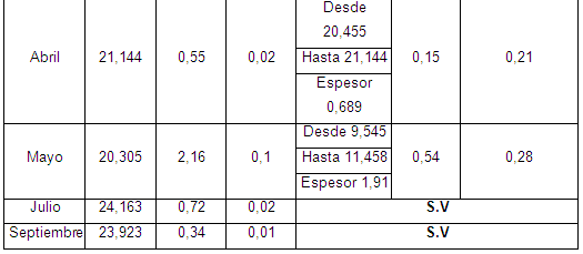 Δ°C /m.: Gradiente de temperatura en la columna de agua. Valor dado por la disminución de la temperatura, por cada metro que se desciende en la profundidad se obtiene al dividir D temp. /Prf. Máx.