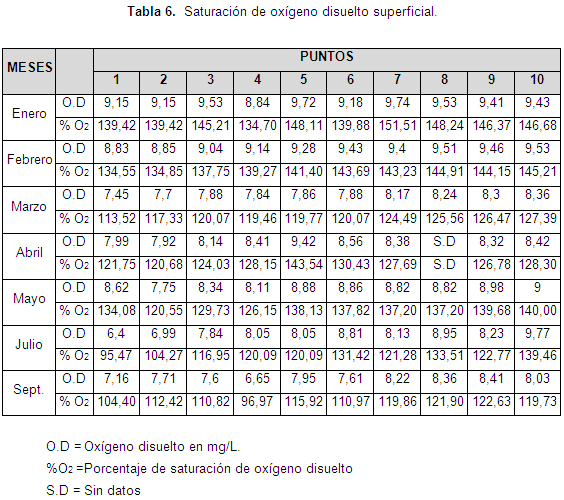 % DE SATURACIÓN DE OXÍGENO SUPERFICIAL. Los resultados de las mediciones de oxígeno disuelto en la superficie y porcentaje de saturacion de oxígeno (%O2) se pueden observar consolidados en la tabla 6.