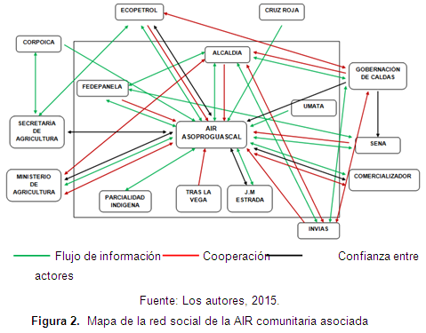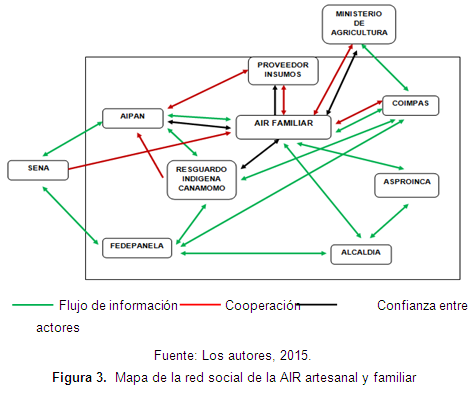 Así mismo asuntos como la flexibilidad de pagos con proveedores de insumos, con comercializadores, entre otros, dan cuenta de una relación de confianza que otros actores han tenido en la AIR, algunos de ellos de carácter direccional, recíproco o nulo como el caso de actores locales importantes tales como Fedepanela, como institución representativa panelera y la Unidad Municipal de Asistencia Técnica Agropecuaria (UMATA), como entidad ejecutora de la política agropecuaria. Un actor tan determinante en la dimensión histórica del territorio como lo es el SENA, ha generado procesos de capacitación discontinuos e inconexos, los cuales han terminado por acabar la confianza de parte de la organización de AIR para este caso.