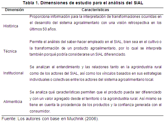 Adicionalmente, las preguntas contenidas en la entrevista fueron planteadas y adaptadas a partir de la metodología de estudio del enfoque SIAL propuesta por Muchnik (2006), en la cual se propone un abordaje multidimensional del sistema agroalimentario, buscando profundidad histórica para identificar la evolución del SIAL en el tiempo, así como la identificación de recursos y dinámicas del territorio (Tabla 1).