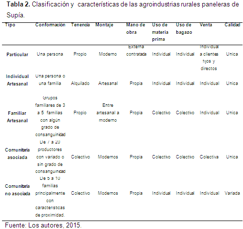 El SIAL panelero de Supía está integrado por una concentración geográfica de agroindustrias rurales que se apoyan en los recursos territoriales y en las dinámicas del territorio que implican diversas formas de acción colectiva, formas de entendimiento y vínculos, tanto dentro de las AIR así como externos, con otros actores del territorio y articulaciones a las cadenas de producción. Estos procesos se han generado a partir de varias características que diferencian cinco tipos de trapiches paneleros, con base en su estructura de conformación, acuerdos en materia de calidad, manejo de materia prima y procesamiento y sus características de organización e incursión en los mercados: AIR particular, AIR individual artesanal, AIR familiar artesanal, AIR comunitaria asociada y AIR comunitaria no asociada (Tabla 2).