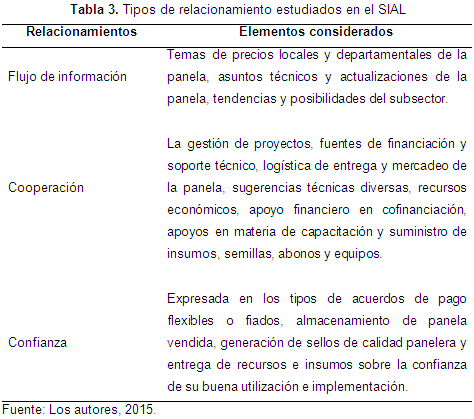 Este flujo importante de información tiene relación con asuntos técnicos, de manejos de materia prima, higiene de la panela, precios de la panela, información de posibilidades de gestión y financiación de proyectos, novedades del subsector, solo las más destacadas dentro de este vínculo entre actores. Adicionalmente, asuntos como la cofinanciación, el soporte técnico, la proporción de repuestos para la infraestructura, la capacitación y los recursos económicos, son formas de cooperación que fluyen entre los actores de esta red social.
