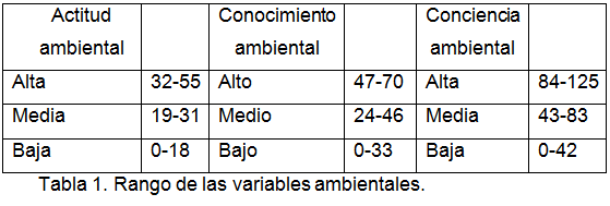 El instrumento utilizado tiene por nombre “escala de actitudes ambientales hacia problemas específicos” (Moreno, 2005), el cual fue utilizado anteriormente en la Universidad Autónoma de Madrid, siendo modificado para su aplicación en México. Consta de 25 ítems, teniendo como respuestas tipo Likert, que requieren para su contestación un tiempo estimado de 15 minutos. Las respuestas van desde totalmente de acuerdo hasta totalmente en desacuerdo, con un puntaje de 5 a 1 respectivamente; por lo que la escala de actitudes ambientales va desde 32 a 55 para una actitud ambiental alta y de 47-70 para un conocimiento ambiental alto, y al sumarse estas dos variables, nos da la conciencia ambiental que va desde 84-125 puntos para una conciencia ambiental alta (ver tabla 1).