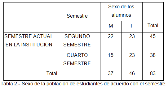 La población estuvo conformada por una frecuencia de 37 personas del sexo masculino y 46 personas del sexo femenino, correspondiendo el 60% del sexo masculino al segundo semestre y el 40 % al cuarto semestre, pero en comparación con el sexo femenino se tiene que es el 50% en el segundo y 50% del cuarto semestre (Ver tabla 2)