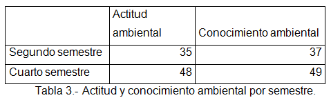 De acuerdo con los resultados encontrados y comparados con la tabla 1, se encontró que en el segundo y cuarto semestres se tiene una actitud y un conocimiento altos (ver tabla 3)