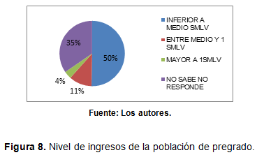 Con respecto al nivel de ingresos es posible decir que el comportamiento es “normal”, pues la DAP estuvo ligada a este patrón de comportamiento. Es decir a menores ingresos menos respuestas afirmativas de disponibilidad a pagar por el servicio y viceversa. A continuación se muestra en términos generales el nivel de ingresos de la población de pregrado y posgrado: