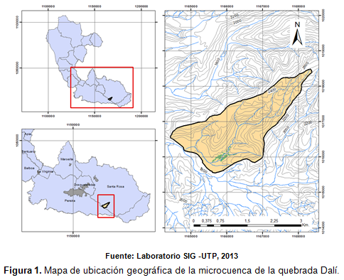 La microcuenca de la quebrada Dalí tiene un cauce principal de segundo orden, con longitud de 5.300 m, de los cuales 787,5 m recorren un pequeño valle en el que se ubica un complejo de humedales (Ossa, 2010). El caso de estudio es el área de la microcuenca que se encuentra dentro de la hacienda Lisbrán con una extensión de 225,65 ha, actualmente propiedad de la empresa de acueducto y alcantarillado Aguas y Aguas de Pereira. El área de estudio se encuentra localizada en el centro-occidente del territorio colombiano, en el flanco occidental de la Cordillera Central en el departamento de Risaralda, entre el rango altitudinal de los 1.850 a los 2.700 m.s.n.m., más exactamente en la vertiente derecha de la cuenca del río Otún, en la vereda El Cedral, municipio de Santa Rosa de Cabal. En la figura 1 se muestra la localización geográfica del área de estudio.