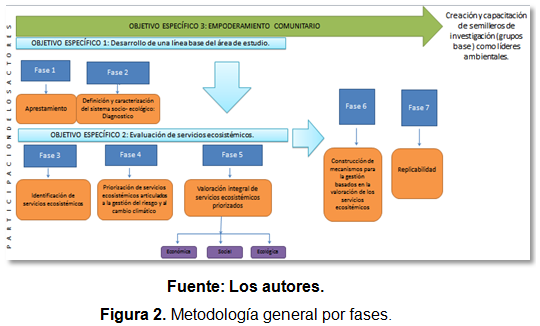 El proyecto se desarrolló mediante dos metodologías; la primera es la adaptación de la metodología para la valoración integral de los servicios ecosistémicos-VISE, que implica el estudio del sistema socio-ecológico en sus componentes sociales, ecológicos y económicos (CIEBREG & IAvH, 2009). La segunda, corresponde a un proceso educativo continuo mediante mecanismos de capacitación desde la academia hacia semilleros de investigación, denominados grupos base o focales. Estos tuvieron la labor de transmitir el conocimiento a un grupo objetivo, que en este caso fueron niños pertenecientes a grupos scout. Se siguió un proceso metodológico de ocho fases como se indica en la figura 2.