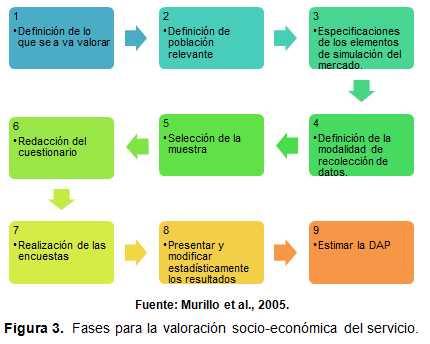 El objetivo es construir las preferencias de los usuarios dadas las respuestas de éstos en encuestas o entrevistas. Dicho método busca estimar la máxima disponibilidad a pagar por la provisión o mejoramiento de un bien ambiental o la compensación mínima que un individuo estaría dispuesto a recibir tras un deterioro del bien (Rojas, 2001). Esta metodología cuenta con diversas opciones para la estimación de la disponibilidad a pagar, en este caso se consideró el método referéndum. En la figura 3 se describe el proceso mediante el cual se desarrolló la valoración socio-económica del servicio ecosistémico de investigación-educación.