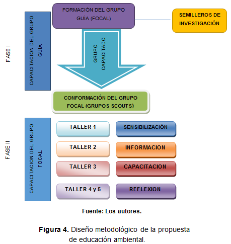 Para el desarrollo del proyecto de educación ambiental se planteó la idea de que el proceso se llevara a cabo mediante cinco sesiones programadas con actividades, objetivos y temas puntuales, organizados en un cronograma diseñado para la segunda mitad del año 2014 y primera mitad del 2015. El enfoque pedagógico fue la transferencia de conocimientos de forma didáctica “juego y experimentación” y no de la manera convencional, en la cual se imparte un tema bajo la figura educador-educado; con esta perspectiva se busca que los niños scouts quieran aprender por cuenta propia, desde luego, con la orientación de un equipo guía (semilleros de investigación) que facilite el proceso.