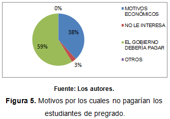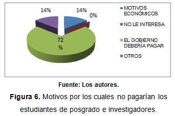 En los estudiantes de pregrado se obtuvo que el 57% de los encuestados está dispuesto a pagar por el servicio de investigación y educación, mientras que un 43% no lo haría, para el caso de estudiantes de posgrado el 70% está dispuesto a pagar mientras que un 30% no lo está; este comportamiento estuvo relacionado en gran parte por el nivel de ingresos y por la percepción de que el gobierno es quien debería cubrir estos pagos y no los estudiantes o investigadores. A continuación (figura 5) se muestran los motivos del por qué no pagarían por el servicio: