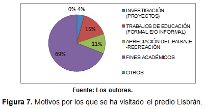 Parte de las respuestas negativas por parte de la población de estudiantes de pregrado puede influir en que un 62 % de los encuestados no conoce Lisbrán, especialmente los estudiantes de los programas de Química; se obtuvo que sólo el 38% de la población encuestada conoce el predio, a continuación se detallan los motivos por los cuales lo han visitado quienes dieron una respuesta afirmativa.
