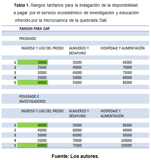 Los rangos por los cuales se preguntó para establecer la disponibilidad a pagar por el servicio fueron construidos a través de mercados existentes en Costa Rica. Se tomó como base el caso de la Organization for Tropical Studies, OTS (La Selva, Las Cruces y Palo Verde), se hizo posteriormente el cálculo acorde al PIB (Patrimonio Interno Bruto) per cápita para Colombia, de cuanto sería el promedio de un colombiano a pagar por el servicio.