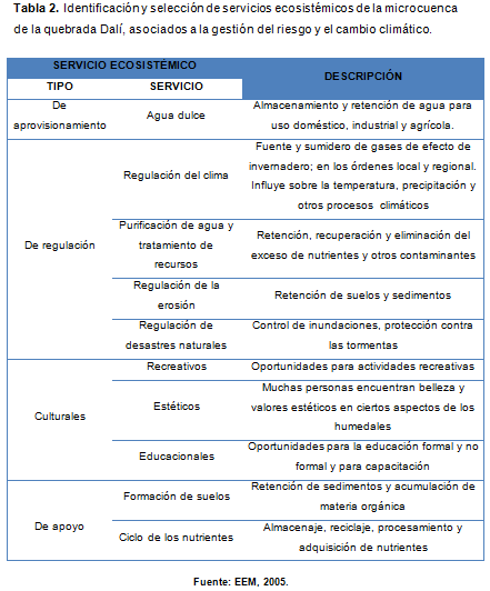 En la tabla 2 se señalan algunos servicios ofrecidos por la microcuenca de la quebrada Dalí, producto de la revisión previa de información secundaria.