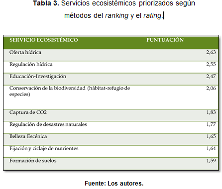La priorización de los servicios ecosistémicos identificados se llevó a cabo mediante una metodología establecida por el Ministerio de Ambiente, Vivienda y Desarrollo Territorial en 2009 (Moreno & Borda, 2009) a través de la construcción de criterios que fueron calificados mediante los métodos del ranking y el rating.