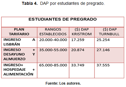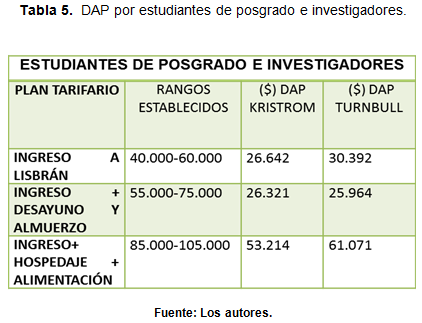 En las tablas 4 y 5 se puede apreciar la diferencia entre los rangos establecidos de manera hipotética (en la sección rangos establecidos) frente a la apreciación real por parte de los encuestados (calculando mediante el método no paramétrico de Kristrom el valor mínimo dispuesto a pagar por el servicio; y con el método no paramétrico de Turnbull, el valor máximo). Los datos obtenidos están por debajo de los rangos por los cuales se indagaron en un comienzo, lo cual se atribuye a la cantidad de respuestas negativas frente a los planes tarifarios expuestos.