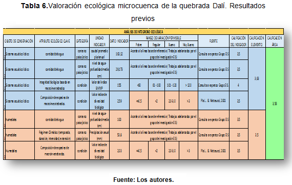 Resultados de la fase de valoración ecológica. Microcuenca de la quebrada Dalí: